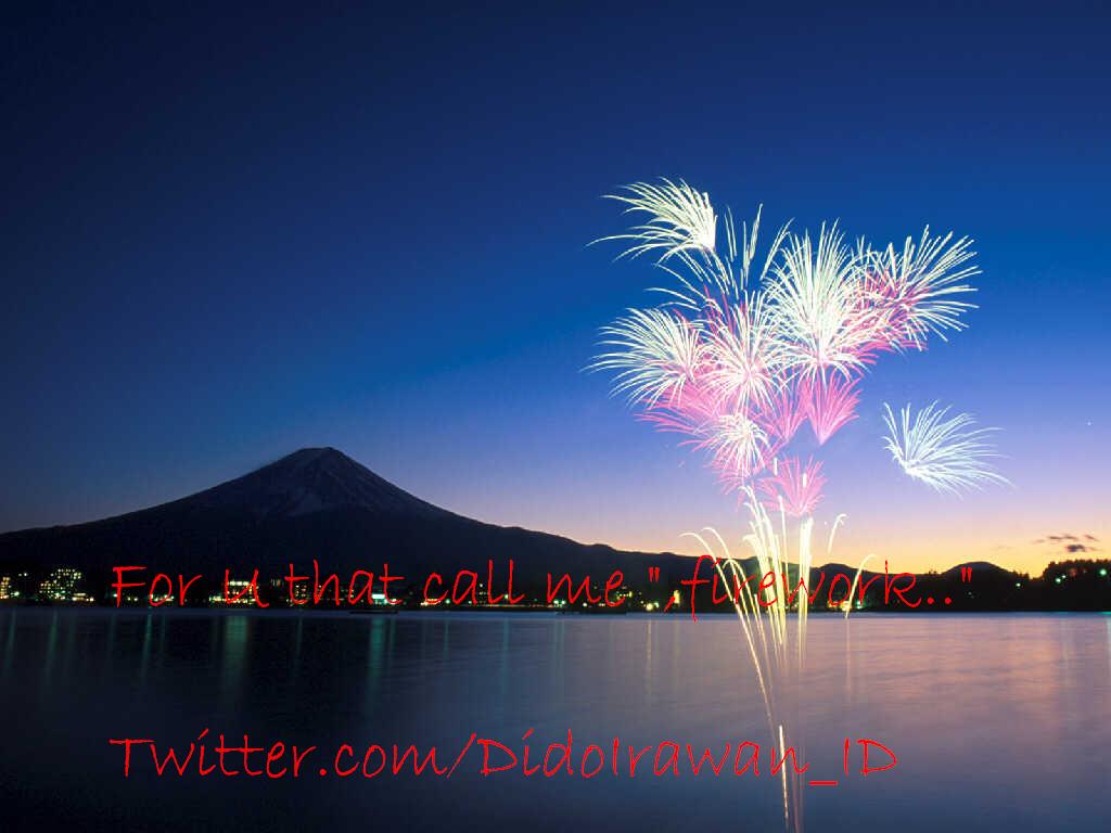 Hm.. gue emang suka juga sih ama lagunya Katy Perry yang Firework.. N' gak bisa gue pungkiri, meski pun gak banyak, gue bisa mengambil beberapa stt dari lagu itu,, Termasuk orang itu.. Ya, langsung aja dia manggil gue Firework .. Hmm.. Why ? Don't know.. Eh, mungkin juga dia merasakan dari lagu itu.. Tapi ya gak tau juga,, Pokonya gue sekarang agak2 kesel aja.. ke dia.. Masa iya langsung marah.. HUh.. !!!!!